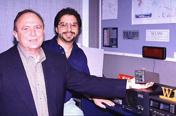 Al Caplan, W0RIC (left), of Timewave holds a DSP-59Y plug-in DSP module that his company has donated to the ARRL Maxim Memorial Station, W1AW. With him is W1AW Station Manager Joe Carcia, NJ1Q. The DSP-59Y board is designed to be installed in a Yaesu speaker cabinet. W1AW also has recently received equipment donations from Alinco (a DX-70TH HF/6-meter transceiver, a DR-605T VHF/UHF FM mobile transceiver, and an EMS-14 desk mike); Yaesu (a G-5400B az/el satellite antenna rotator, for an installation going up next spring); and L. L. Grace (a Kansas City Tracker with Doppler shift tuning option). Carcia expressed "deepest appreciation" to all of the manufacturers who have donated equipment to W1AW. (The ARRL is a tax-exempt, not-for-profit organization as described in Section 501(c)(3) of the Internal Revenue Code. Voluntary donations are tax-deductible to the extent provided by law.)