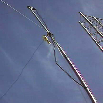 A pet cockatiel that flew the coop sits on a tower support wire prior to rescue by the ham radio tower crew.