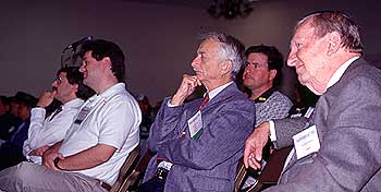 ![]() Among those turning out to hear the good news about Phase 3D at Dayton were (l-r) Frank Bauer, KA3HDO; Matt Bordelon, KC5BTL; past astronaut Owen Garriott, W5LFL--the first astronaut to use Amateur Radio from space--and former NBC correspondent and producer Roy Neal, K6DUE. |