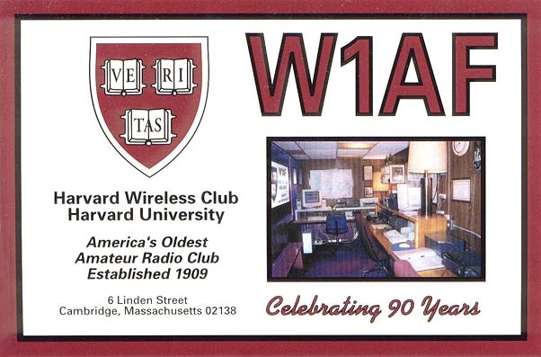 A special 90th anniversary QSL card will be available for stations working W1AF during the special event. QSL to Harvard Wireless Club, W1AF, Harvard University, 6 Linden St, Cambridge, MA 02138. For more information, contact the club at w1af@harvard.edu. The club's Web site is at http://www.hcs.harvard.edu/~w1af/.