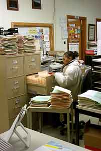 Linda Brodhurst of the ARRL-VEC staff helps handle the growing mountain of paperwork. [Rick Lindquist, N1RL]