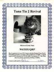 The Tuna Tin 2 Revival certificate, showing the cover photo of the May 1976 QST that included Doug DeMaw's original TT2 construction article. |