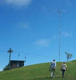 The site of the S512T station operated by the Lithuanian team of LY3BA and LY2BM was located at a ski lift shack. All WRTC-2000 sites were on hilltops or mountains. The triband Yagi and the Windom antenna for 80 and 40 meters are clearly visible above the heads of Dick Norton, N6AA (left) and Tine Brajnik, S50A. [ARRL photo]