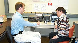 ARRL HQ staffers Brennan Price, N4QX, and John Hennessee, N1KB, troll 10 meters at W1INF, keeping an ear open for possible unlicensed operators. [ARRL Photo]