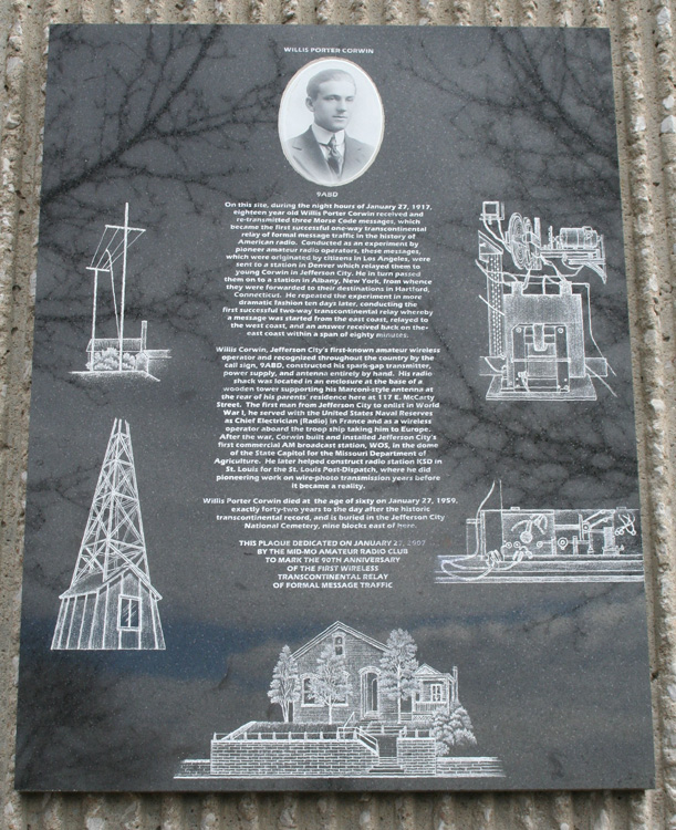 Willis Corwin is Jefferson City's first-known amateur wireless operator. His call sign, 9ABD, was one of the earliest assigned by the federal government and appears prominently in radio journals of that era. Building his station from radio circuits gleaned from magazines and his own inventiveness, Willis' radio shack was located in an unheated enclosure at the base of a wooden tower he constructed to elevate his Marconi-style antenna array 85 feet above the backyard of his parents' residence at 117 E McCarty Street, now a bank parking lot.