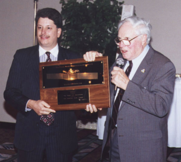 | ARRL Vice President Joel Harrison, WB5IGF, accepts a plaque from AMSAT-NA President Bill Tynan, W3XO. The plaque commemorates the dedication of the Phase-3D spaceframe to the ARRL during the 1996 AMSAT-NA Space Symposium in Tucson, Arizona, November 8-10.--Steve Ford, WB8IMY, photo |