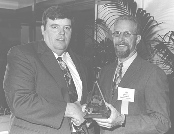 Russ Stafford, AA3CH (left), receives the Leadership Class of 1997 award from Pat Croce, president of the Philadelphia 76ers basketball team.