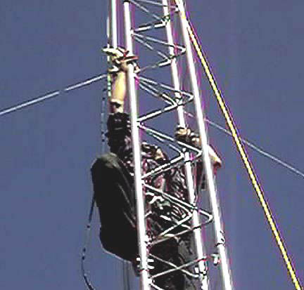 A bird in the hand is worth a climb up the tower. Dave Trujillo snags the cockatiel. Photos by Mike Reed, N7ZEF
