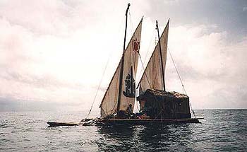 The raft La Manteña under way in the Pacific. [Courtesy of Cameron Smith] |