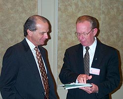 Riley Hollingsworth (left) chats with ARRL President Jim Haynie, W5JBP, prior to the ARRL Board of Directors meeting in Hartford, Connecticut. [ARRL Photo] |