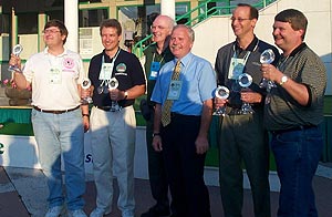 (Left to right) Doug Grant, K1DG; Dan Street, K1TO; Chief Referee David Sumner, K1ZZ; WRTC Organizing Committee Chairman Tine Brajnik, S50A; Jeff Steinman, N5TJ; and John Dorr, K1AR, at the WRTC-2000 closing ceremonies in Bled, Slovenia. The K1TO-N5TJ team came in at first place; the K1DG-K1AR combo placed third. [ARRL photo]