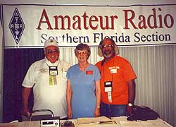 (L-R) REACT Board Chairman Frank Jennings, ARRL Southern Florida SM Phyllisan West, KA4FZI, and REACT International President Harry Hawkins, at the ARRL booth at the recent REACT International convention in Florida.