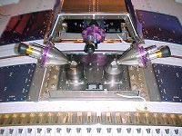 Two thruster modules like this one consisting of three thrusters each are integrated into the vehicle equipment bay of the Ariane 5 launch vehicle. [Arianespace photo] |