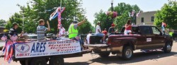 Putting the float together was very easy - we used a single-axle trailer owned and pulled by Ed KDØLNT. We placed our club banner on one side and an ARES Rapid Response Team banner on the other side of the trailer (visible in the photo). I provided two radio stations in the trailer. The VHF/UHF station was a self-contained "go-kit" station-in-a-cooler powered by a 12V lawn-tractor battery with a GP-6 dual-band vertical mounted on PVC pipe sections that attach to the cooler. The HF station was an IC-7000 on a card table and a 20 meter Hamstick whip on a triple mag-mount on the hood of the truck. Power was provided by a Honda generator in the truck. It was important to get the antenna away from the trailer and use a ground wire to the truck frame in order to reduce RF on the keying paddle and to have a good radiated signal. We operated phone on the club's VHF repeater and CW on HF, making about 20 QSOs on the repeater during the two-hour parade and about 15 QSOs on HF from WA to FL. A pair of speakers let the crowd hear the action on HF. People enjoyed hearing the code with many recognizing it for what it was - there was lots of interest.