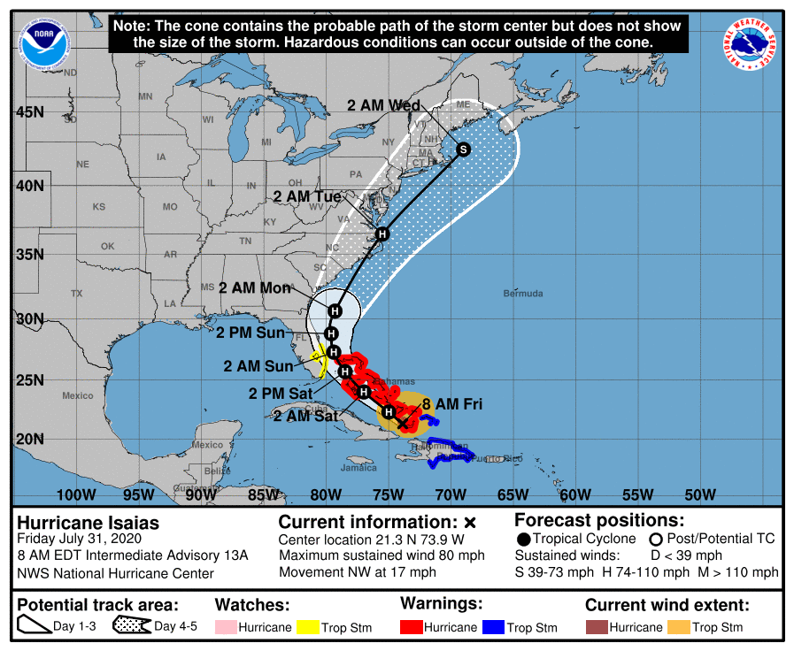 “On the forecast track, the center of Isaias will continue to move near or over the Southeastern Bahamas today. Isaias is forecast to be near the central Bahamas tonight, and move near or over the northwestern Bahamas on Saturday and near the east coast of the Florida peninsula Saturday afternoon through Sunday.