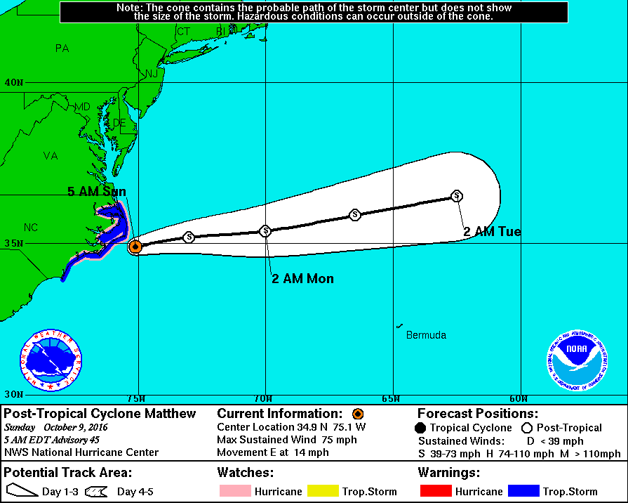 As of 0900 UTC, Matthew was still generating strong winds over eastern North Carolina, as it moves to the east-northeast just off the Outer Banks. The NHC reported that record-breaking flooding continues over portions of eastern North Carolina. The storm was some 30 miles southeast of Cape Hatteras, with maximum sustained winds of 75 MPH, moving east at 14 MPH. The Hurricane Warning from Little River Inlet to south of Cape Fear has been discontinued, and the Hurricane Warning from Cape Fear to Surf City has been replaced with a Tropical Storm Warning, the NHC said.