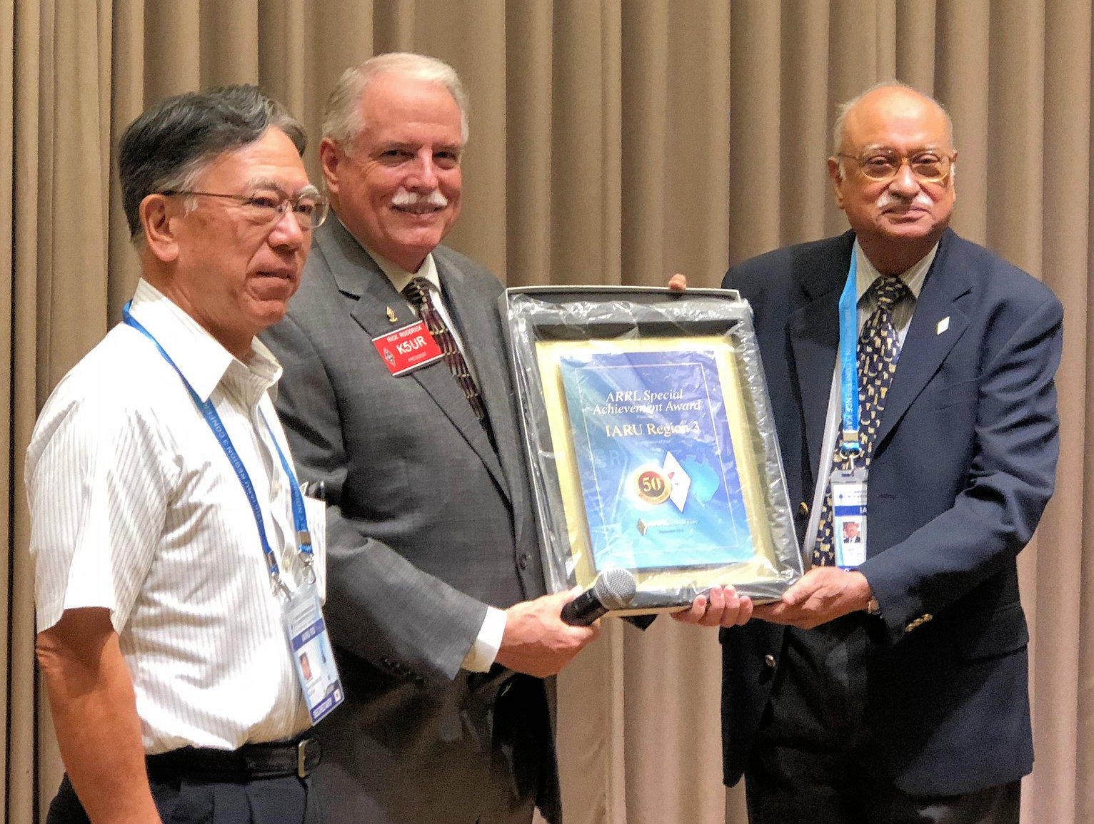 ![At the IARU Region 3 Conference in Seoul, Korea, ARRL President Rick Roderick, K5UR, presents IARU Region 3 Chairman Gopal Madhavan, VU2GMN (right), and Region 3 Secretary Ken Yamamoto, JA1CJP (left), a plaque recognizing and congratulating IARU Region 3 on its 50th anniversary [Jay Bellows, K0QB, Photo].](/img/130x97/exact/News/IARU Region 3 2018 Conference Presentation.jpg)