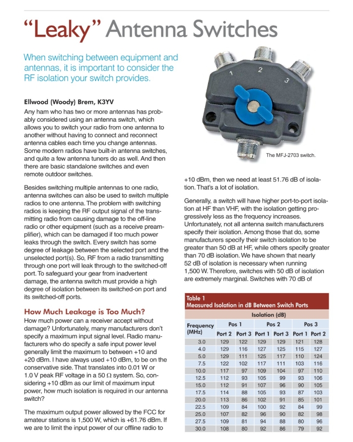 The winning article for the March 2020 QST Cover Plaque award is “Leaky” Antenna Switches by Ellwood (Woody) Brem, K3YV.