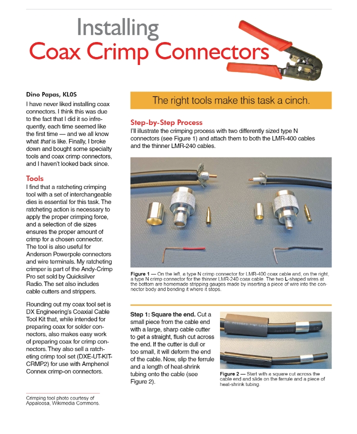 The winning article for the February 2019 QST Cover Plaque award is “Installing Coax Crimp Connectors” by Dino Papas, KLØS. The QST Cover Plaque Award -- given to the author or authors of the most popular article in each issue -- is determined by a vote of ARRL members on the QST Cover Plaque Poll web page. Cast a ballot for your favorite article in the March issue today.