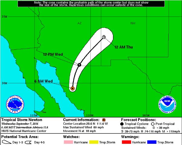 As of 1200 UTC on September 7, Tropical Storm Newton was about 55 miles northwest of Hermosillo, Mexico, and about 180 miles south-southwest of Tucson, Arizona, with maximum sustained winds of 60 MPH, moving north at 17 MPH. Rapid weakening will continue as Newton moves farther inland. The government of Mexico has discontinued all coastal watches and warnings. High wind watches and wind advisories are in effect for portions of the US Southwest. On its current forecast track, the storm’s center will move over extreme northwestern Mexico this morning and into southeastern Arizona this afternoon.
