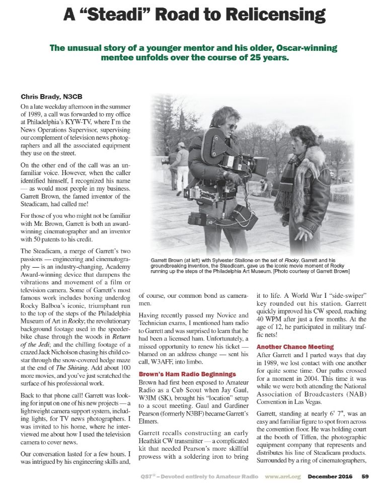 The winning article for the December 2016 QST Cover Plaque award is “A ‘Steadi’ Road to Relicensing” by Chris Brady, N3CB. The QST Cover Plaque Award -- given to the author or authors of the most popular article in each issue -- is determined by a vote of ARRL members on the QST Cover Plaque Poll web page. Cast a ballot for your favorite article in the January issue today.
