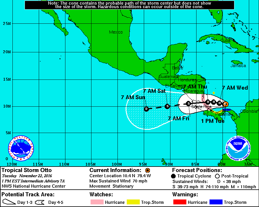 As of 1800 UTC, the National Hurricane Center was predicting that Otto would become a hurricane later on Tuesday. The storm was some 320 miles east-southeast of Bluefields, Nicaragua, and some 245 mile east of Limon, Costa Rico, with maximum sustained winds of 70 MPH. The storm is stationary.