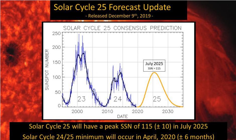 The NOAA/NASA-co-chaired international Solar Cycle Prediction Panel has released its latest forecast for to forecast Solar Cycle 25. The panel’s consensus calls for a peak in July 2025 (±8 months), with a smoothed sunspot number of 115. The panel agreed that Cycle 25 will be of average intensity and similar to Cycle 24. The panel additionally concurred that the solar minimum between Cycles 24 and 25 will occur in April 2020 (±6 months). If the solar minimum prediction is correct, this would make Solar Cycle 24 the seventh longest on record at 11.4 years. In its preliminary forecast released last April, the scientists on the panel forecast that Solar Cycle 25 would likely be weak, much like the current Cycle 24.