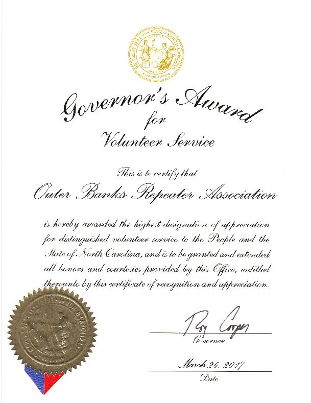 Outer Banks Repeater Association Receives 2017 Governor’s Volunteer Service Award