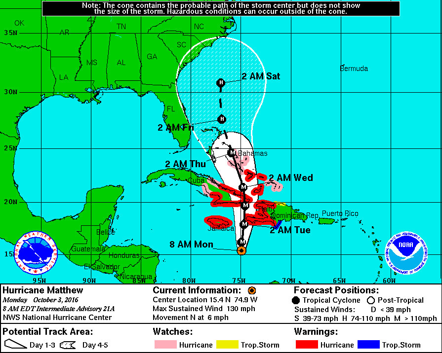 As of 1200 UTC, Hurricane Matthew was some 220 miles southeast of Kingston, Jamaica, and 280 miles southwest of Port au Prince, Haiti, with maximum sustained winds of 130 MPH. The storm is moving north at 6 MPH. Hurricane force winds extend 30 miles from the storm’s center, while tropical storm force winds extend 195 miles.