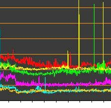 The RF Seismograph propagation tool employs an omnidirectional multiband antenna to monitor JT65 frequencies (±10 kHz) on 80, 40, 30, 20, 15, and 10 meters. Recorders monitor the background noise and display the result in six color-coded, long-duration graphs displaying 6 hours of scans. When signals are present on a band, its graph trace starts to resemble a series of vertical bars.
