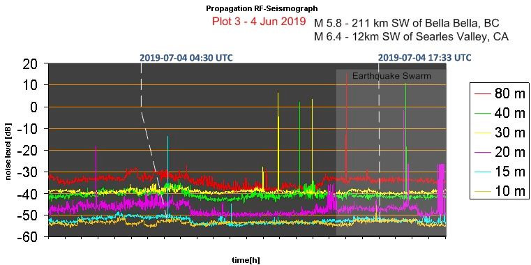 On July 6, Schwarz said, the RF Seismograph showed an increase in noise on 80 meters some 13 hours beforehand, as well as some propagation changes on 40 and 30 meters — low before the quake and increasing in its wake. Increases in noise on 15 and 10 meters were detected some 10 hours before the earthquake, diminishing about 3 hours afterward. In addition, noise level and propagation changes on 20 meters some 3 hours before the earthquake.