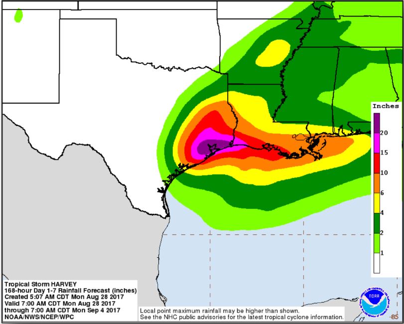 Flooding in the affected region of southeastern Texas is of catastrophic and historic proportions, with torrential rain continuing and causing life- threatening flooding. According to a Federal Emergency Management Agency (FEMA) update, additional rain accumulations of 15 to 25 inches expected through the end of the week over the upper Texas coast into southwestern Louisiana. An estimated 12 million people are under a flash flood emergency in three counties as well as the City of Houston. Harvey moved back into the Gulf of Mexico today (August 28) and was expected to make a second landfall.