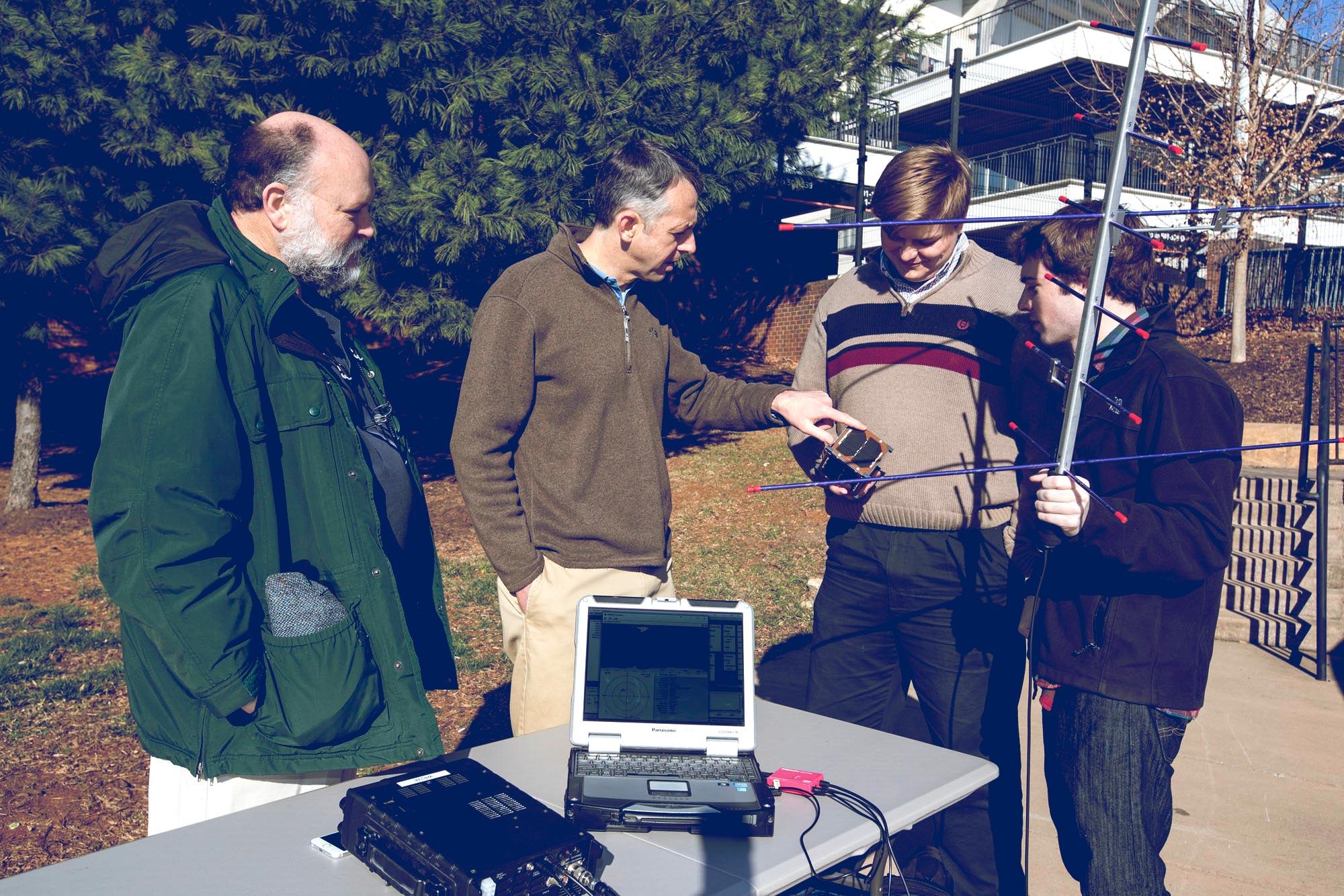![UVA Amateur Radio club trustee Michael McPherson, KQ9P (left); Professor Chris Goyne; and engineering students Colin Mitchell, KN4BBF, and Tyler Gabriele, KN4BBE, prepare to track a satellite using a UHF radio and hand-held antenna. Gabriele is holding what appears to be a lab model of the UVA CubeSat. [Dan Addison/University Communications photo]](/img/130x97/exact/News/UVA CubeSat project Group.jpg)