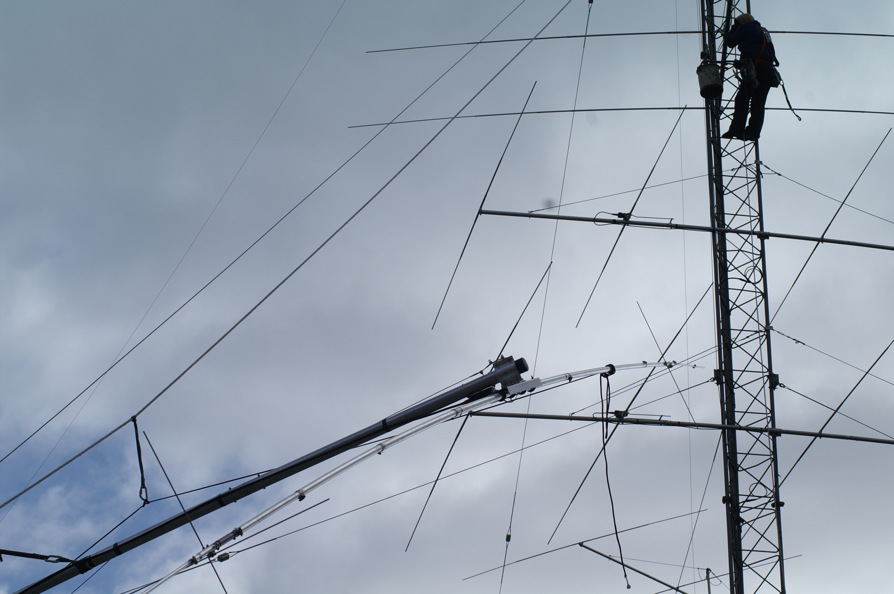 “Until we could get these antennas replaced, we had some temporary fixes so we could still send out the bulletins and provide a station for our visitors,” Carcia explained. “For 40 meters, I homebrewed a ‘fat dipole,’ and for 80 meters, I strung a simple dipole off the north tower.”