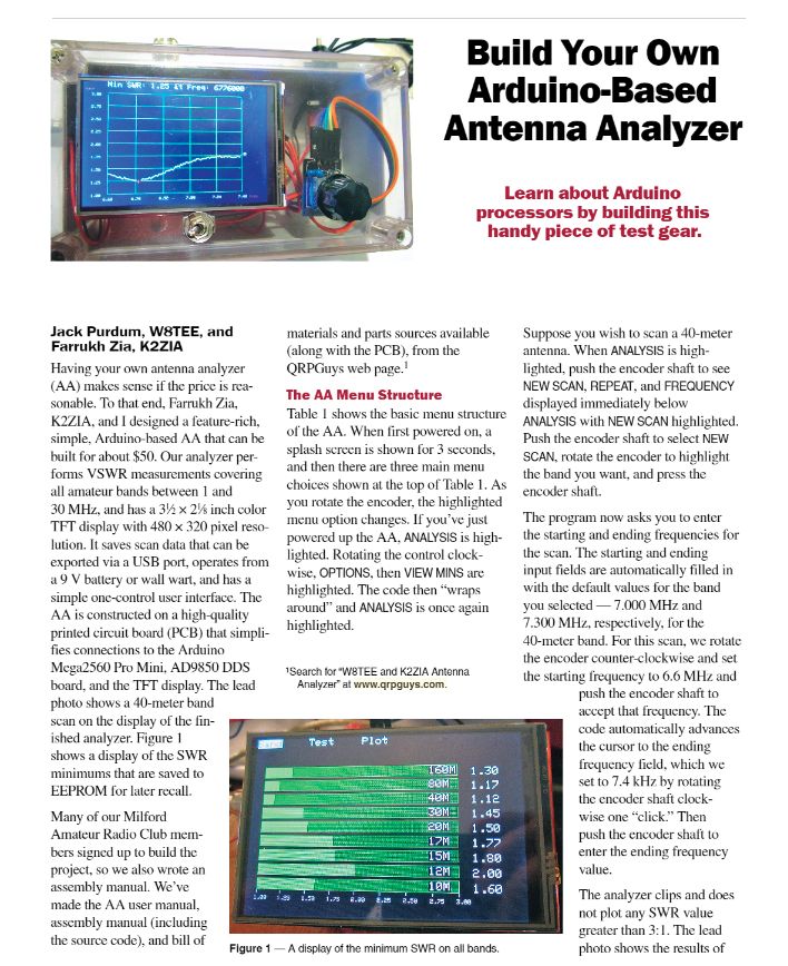 The winning article for the November 2017 QST Cover Plaque award is “Build Your Own Arduino-Based Antenna Analyzer” by Jack Purdum, W8TEE, and Farrukh Zia, K2ZIA. The QST Cover Plaque Award -- given to the author or authors of the most popular article in each issue -- is determined by a vote of ARRL members on the QST Cover Plaque Poll web page. Cast a ballot for your favorite article in the December issue today.