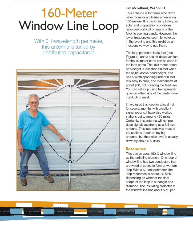 The winning article for the November 2019 QST Cover Plaque award is “A 160-Meter Window Line Loop” by Jim McLelland, WA6QBU.