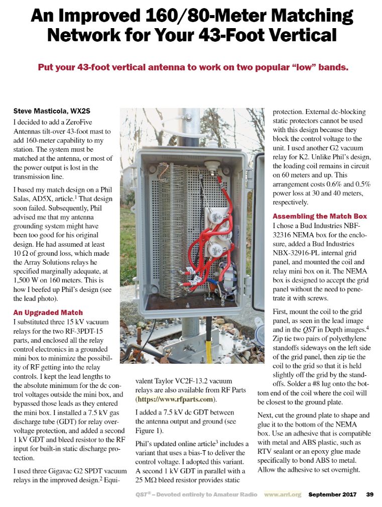 The winning article for the September 2017 QST Cover Plaque award is “An Improved 160/80-Meter Matching Network for your 43-Foot Vertical” by Steve Masticola, WX2S. The QST Cover Plaque Award -- given to the author or authors of the most popular article in each issue -- is determined by a vote of ARRL members on the QST Cover Plaque Poll web page. Cast a ballot for your favorite article in the October issue today.