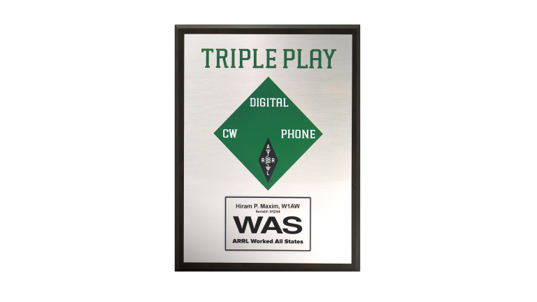 h) Triple-Play WAS. At completion of WAS on the CW, Phone and Digital modes, application can be made for the WAS Triple-Play Award Certificate or choice of two (2) plaque styles. To apply Go Here